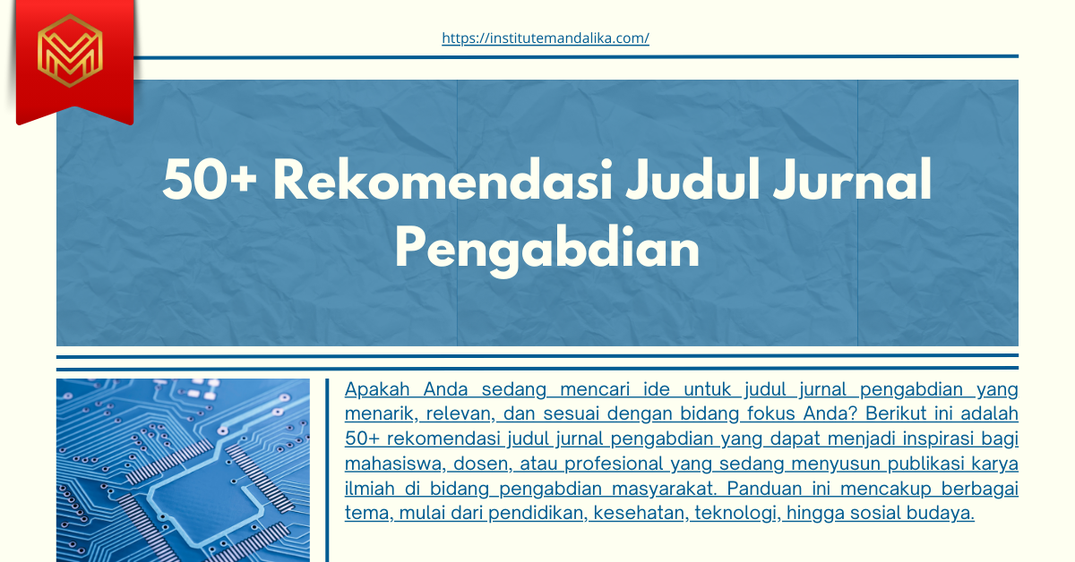 Apakah Anda mencari ide untuk judul jurnal pengabdian yang menarik dan relevan? Berikut rekomendasi judul jurnal untuk mahasiswa, dosen, atau profesional yang menyusun publikasi karya ilmiah di bidang pengabdian masyarakat, mencakup tema pendidikan, kesehatan, teknologi, hingga sosial budaya.