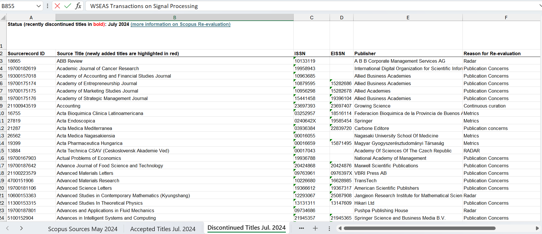 5. Jika menjumpai nama jurnal di kolom “Source Title” pada Sheet “Discontinued Titles (bulan)(tahun)” seperti gambar di bawah. Anda akan menumakan daftar jurnal yang di-discontinued Scopus. Judul jurnal yang berwarna merah seperti Acta Medica Mediterranea menunjukkan jurnal discontinued yang baru saja ditambahkan. Keterangan tersebut akan Anda dapatkan pada baris pertama pada Sheet ini.