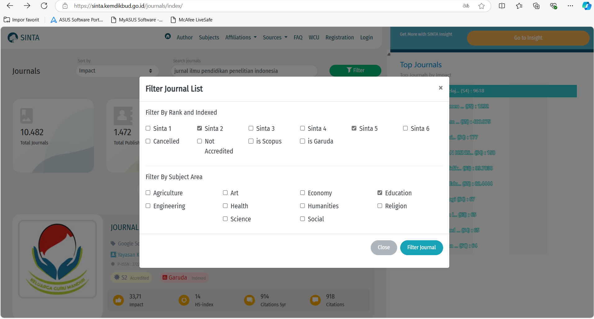 e.  Namun, jika  ingin mencari jurnal dengan tingkat akreditasi tertentu, kita dapat menggunakan fitur filter. Dengan fitur ini, kita dapat menentukan tingkat akreditasi dan focus jurnal yang ingin dicari.