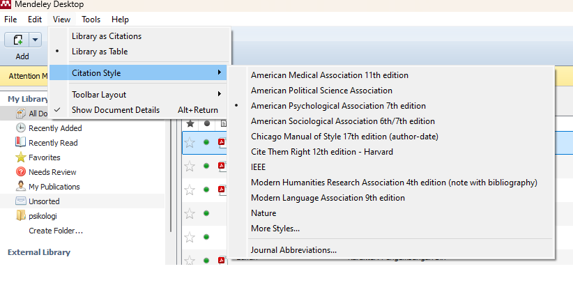 • Atur Gaya Sitasi: Di Mendeley, pilih gaya sitasi yang sesuai dengan kebutuhan Anda. Klik “View” dan pilih “Citation Style” untuk memilih gaya sitasi yang diinginkan, seperti APA, IEEE, atau gaya lainnya.