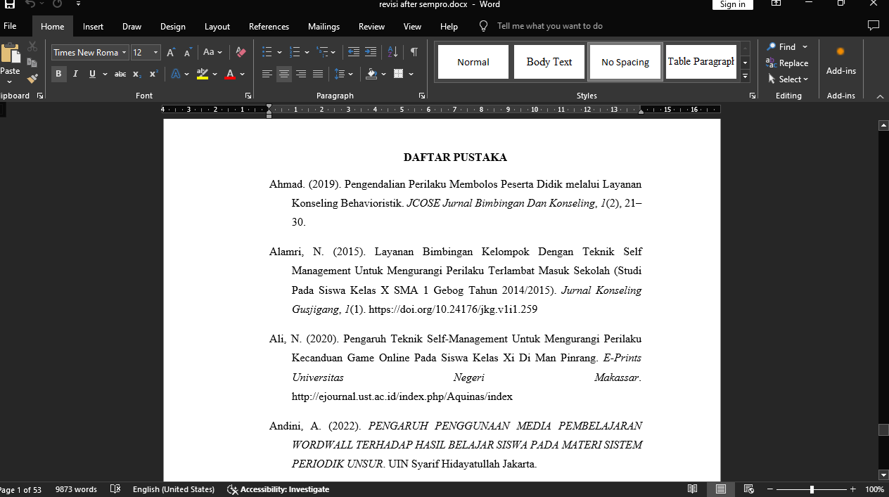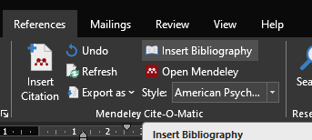 • Buat Daftar Pustaka: Setelah menambahkan semua sitasi, letakkan kursor di akhir dokumen Anda. Klik “Insert Bibliography” pada plugin Mendeley. Mendeley akan otomatis membuat daftar pustaka sesuai dengan gaya sitasi yang telah Anda pilih dan mengurutkannya secara alfabetis.