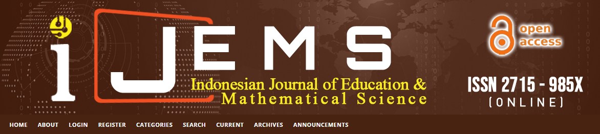 Jurnal Pendidikan dan Ilmu Matematika Indonesia adalah jurnal double-blind peer-review dan akses terbuka. Jurnal IJEMS merupakan salah satu jurnal internasional yang dikelola Universitas Muhammadiyah Sumatera Utara untuk meningkatkan kemampuan dosen dan peneliti dalam menulis dan melakukan penelitian di bidang pendidikan, matematika dan sains. Semua artikel akan ditinjau oleh para ahli sebelum diterima untuk dipublikasikan.