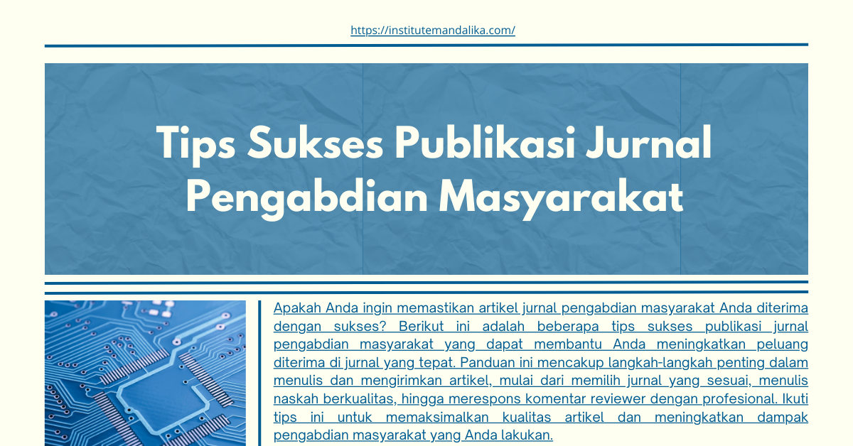 Apakah Anda ingin memastikan artikel jurnal pengabdian masyarakat Anda diterima dengan sukses? Berikut ini adalah beberapa tips sukses publikasi jurnal pengabdian masyarakat yang dapat membantu Anda meningkatkan peluang diterima di jurnal yang tepat. Ikuti tips ini untuk memaksimalkan kualitas artikel dan meningkatkan dampak pengabdian masyarakat yang Anda lakukan.